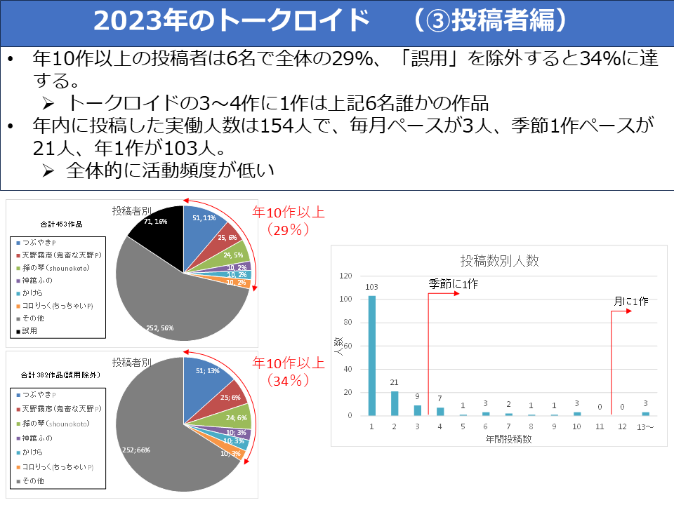 ここで一旦、実働人数の話にうつります。2023年にトークロイドを投稿した人は154人でした。が、トークロイド作品(お喋りが主体の作品)となると123人となります。31人は楽曲のみの投稿でした。123人という数字、どう思うでしょうか。SNSで受ける感覚に近い気もします。そして投稿数の話も絡めましょう。年1作のみの投稿者は103人ですが、このうち29名が先ほど挙げた楽曲のみの方でした。やはり楽曲にトークロイドを使って複数作品を出すという人は少ないようです。